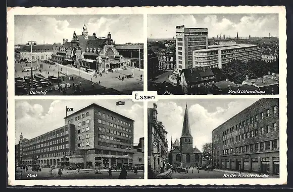 AK Essen, Strassenpartie am Deutschlandhaus, an der Münsterkirche und Post,