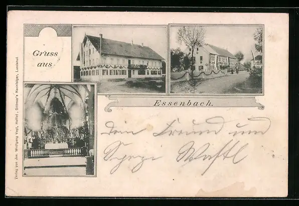 AK Essenbach, Geschmücktes Haus mit Strasse, Kircheninneres