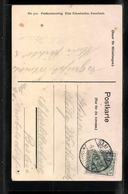 Personenbezogene Daten auf der Rückseite der Karte wurden durch blauen Textmarker unkenntlich gemacht. Die blauen Stellen sind auf die Vorderseite durchgeweicht und wirken sich negativ auf das Postkartenfoto aus