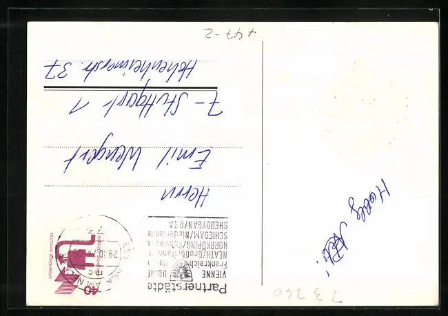 Personenbezogene Daten auf der Rückseite der Karte wurden durch blauen Textmarker unkenntlich gemacht. Die blauen Stellen sind auf die Vorderseite durchgeweicht und wirken sich negativ auf das Postkartenfoto aus