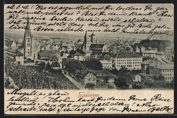 AK Esslingen, Ortsansicht von einer Anhöhe mit Kirche