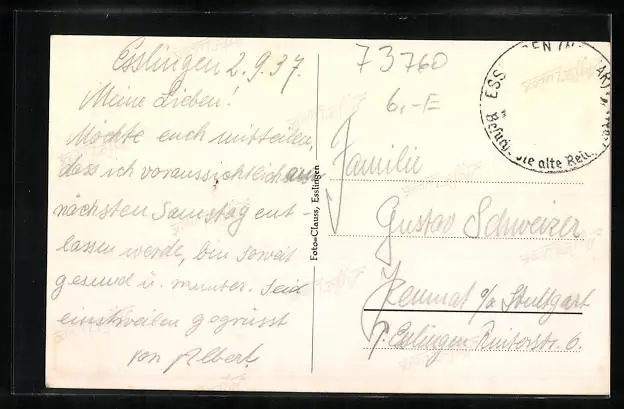 alte Ansichtskarte, gelaufen 1937, Briefmarke entfernt, guter Zustand