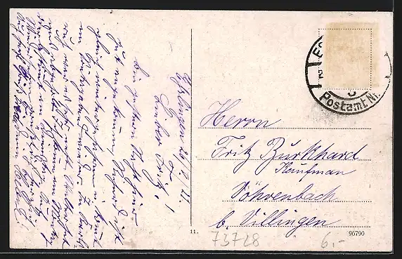 Personenbezogene Daten auf der Rückseite der Karte wurden durch blauen Textmarker unkenntlich gemacht. Die blauen Stellen sind auf die Vorderseite durchgeweicht und wirken sich negativ auf das Postkartenfoto aus
