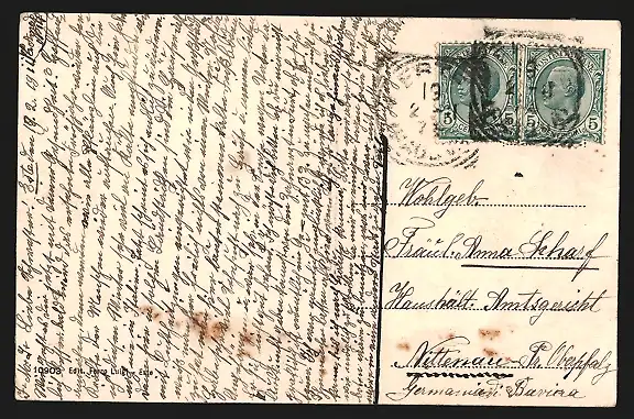 Personenbezogene Daten auf der Rückseite der Karte wurden durch blauen Textmarker unkenntlich gemacht. Die blauen Stellen sind auf die Vorderseite durchgeweicht und wirken sich negativ auf das Postkartenfoto aus