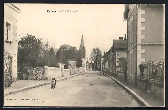 AK Esvres, Rue Principale avec un chien et vue sur l`église