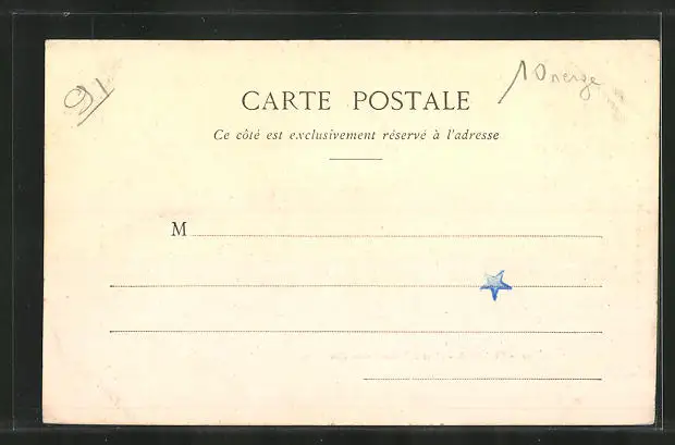 Personenbezogene Daten auf der Rückseite der Karte wurden durch blauen Textmarker unkenntlich gemacht. Die blauen Stellen sind auf die Vorderseite durchgeweicht und wirken sich negativ auf das Postkartenfoto aus