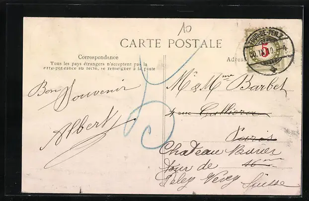 Personenbezogene Daten auf der Rückseite der Karte wurden durch blauen Textmarker unkenntlich gemacht. Die blauen Stellen sind auf die Vorderseite durchgeweicht und wirken sich negativ auf das Postkartenfoto aus