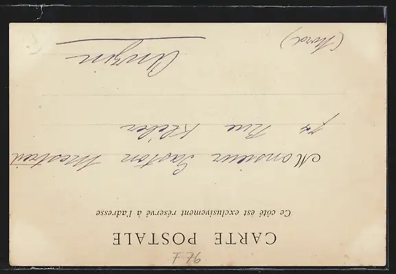 Personenbezogene Daten auf der Rückseite der Karte wurden durch blauen Textmarker unkenntlich gemacht. Die blauen Stellen sind auf die Vorderseite durchgeweicht und wirken sich negativ auf das Postkartenfoto aus