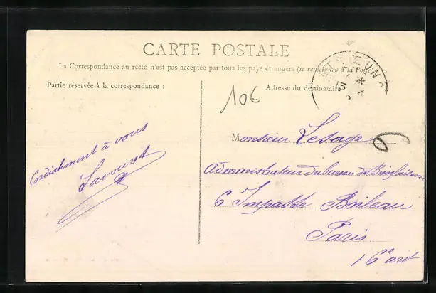 Personenbezogene Daten auf der Rückseite der Karte wurden durch blauen Textmarker unkenntlich gemacht. Die blauen Stellen sind auf die Vorderseite durchgeweicht und wirken sich negativ auf das Postkartenfoto aus