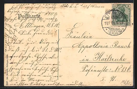 gelaufen 1906, Einriss oben li., rückseitig Oberflächenschaden, guter Zustand