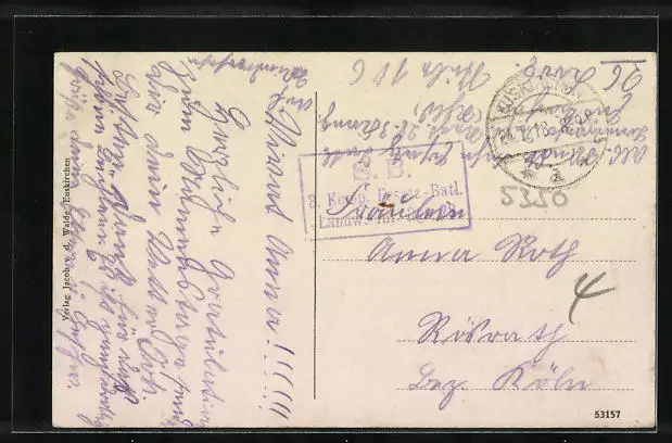 Personenbezogene Daten auf der Rückseite der Karte wurden durch blauen Textmarker unkenntlich gemacht. Die blauen Stellen sind auf die Vorderseite durchgeweicht und wirken sich negativ auf das Postkartenfoto aus