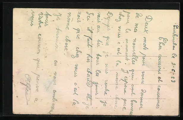 Personenbezogene Daten auf der Rückseite der Karte wurden durch blauen Textmarker unkenntlich gemacht. Die blauen Stellen sind auf die Vorderseite durchgeweicht und wirken sich negativ auf das Postkartenfoto aus