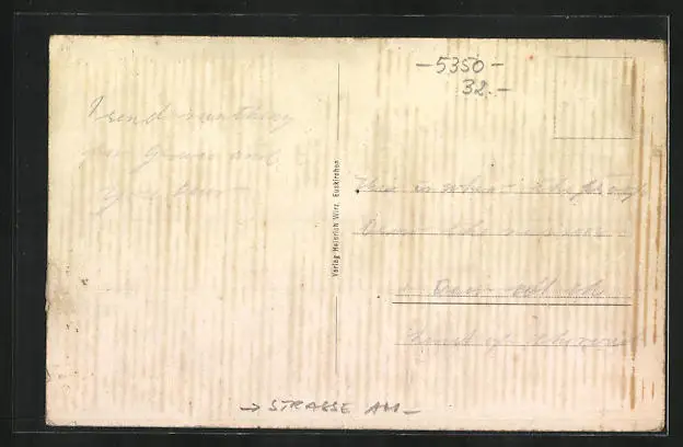 Personenbezogene Daten auf der Rückseite der Karte wurden durch blauen Textmarker unkenntlich gemacht. Die blauen Stellen sind auf die Vorderseite durchgeweicht und wirken sich negativ auf das Postkartenfoto aus