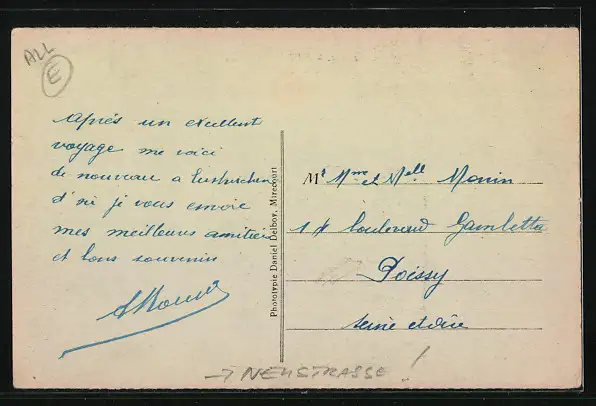 Personenbezogene Daten auf der Rückseite der Karte wurden durch blauen Textmarker unkenntlich gemacht. Die blauen Stellen sind auf die Vorderseite durchgeweicht und wirken sich negativ auf das Postkartenfoto aus