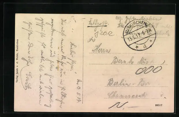 Personenbezogene Daten auf der Rückseite der Karte wurden durch blauen Textmarker unkenntlich gemacht. Die blauen Stellen sind auf die Vorderseite durchgeweicht und wirken sich negativ auf das Postkartenfoto aus
