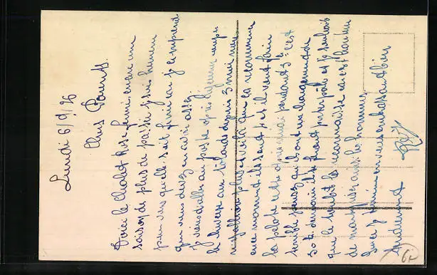 Personenbezogene Daten auf der Rückseite der Karte wurden durch blauen Textmarker unkenntlich gemacht. Die blauen Stellen sind auf die Vorderseite durchgeweicht und wirken sich negativ auf das Postkartenfoto aus