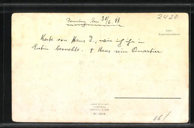 Personenbezogene Daten auf der Rückseite der Karte wurden durch blauen Textmarker unkenntlich gemacht. Die blauen Stellen sind auf die Vorderseite durchgeweicht und wirken sich negativ auf das Postkartenfoto aus