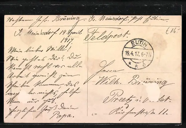 alte Ansichtskarte, gelaufen als Feldpost 1917, rückseitig Klebe- und Papierreste, rückseitig Oberflächenschaden, Eckknick unten re., guter Zustand
