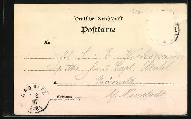 alte Ansichtskarte, gelaufen 1897, Briefmarke entfernt, rückseitig Oberflächenschaden, guter Zustand