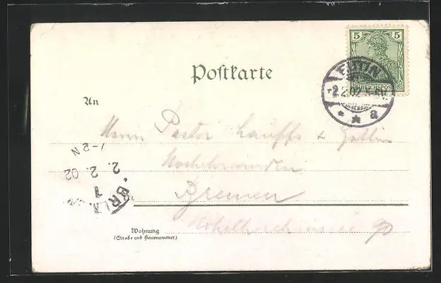 alte Ansichtskarte, gelaufen 1902, Eckknicke oben u. unten re., guter Zustand