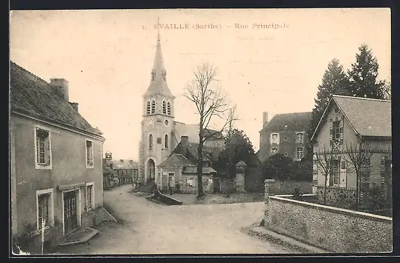 AK Évaillé, Rue Principale avec église et maisons anciennes
