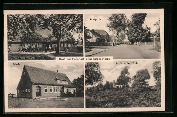 AK Evendorf, Schule, Dorfpartie, Partie in der Lüneburger Heide