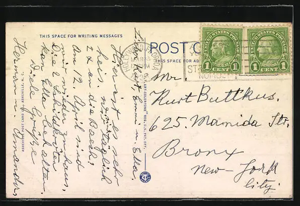 Personenbezogene Daten auf der Rückseite der Karte wurden durch blauen Textmarker unkenntlich gemacht. Die blauen Stellen sind auf die Vorderseite durchgeweicht und wirken sich negativ auf das Postkartenfoto aus