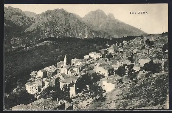 AK Evisa, vue du village avec montagnes en arrière-plan