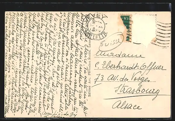 alte Ansichtskarte, gelaufen, Briefmarke entfernt, rückseitig Oberflächenschaden, Stempelspur, guter Zustand