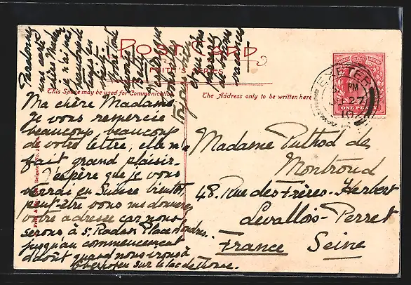 Personenbezogene Daten auf der Rückseite der Karte wurden durch blauen Textmarker unkenntlich gemacht. Die blauen Stellen sind auf die Vorderseite durchgeweicht und wirken sich negativ auf das Postkartenfoto aus