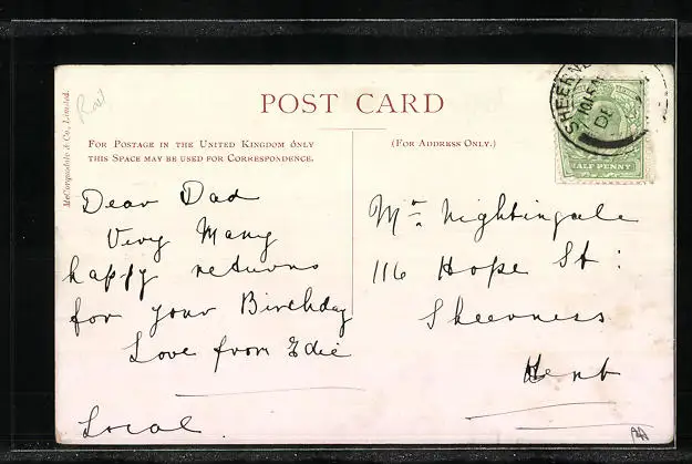 Personenbezogene Daten auf der Rückseite der Karte wurden durch blauen Textmarker unkenntlich gemacht. Die blauen Stellen sind auf die Vorderseite durchgeweicht und wirken sich negativ auf das Postkartenfoto aus