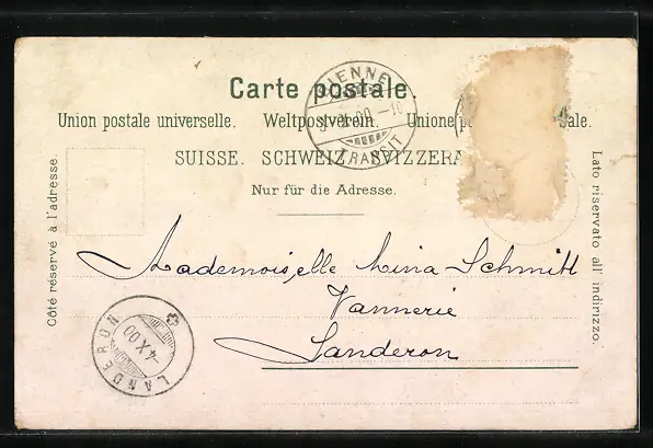 gelaufen 1900, Briefmarke entfernt, rückseitig Oberflächenschaden, Einriss li. mittig, guter Zustand
