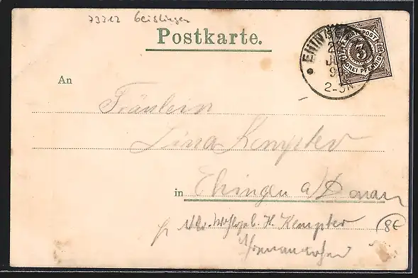 alte Ansichtskarte, gelaufen 1899, Eckknick oben re., guter Zustand