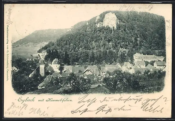 AK Eybach, Ortsansicht mit Himmelsfelsen