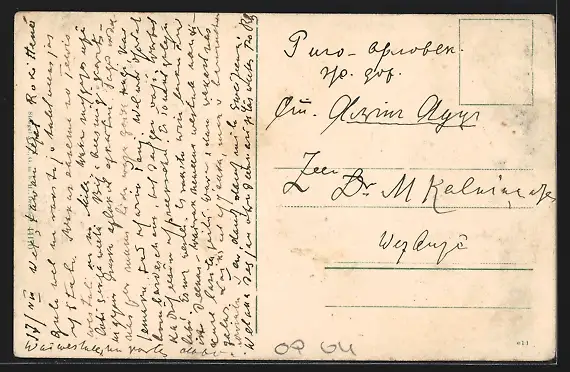 Personenbezogene Daten auf der Rückseite der Karte wurden durch blauen Textmarker unkenntlich gemacht. Die blauen Stellen sind auf die Vorderseite durchgeweicht und wirken sich negativ auf das Postkartenfoto aus