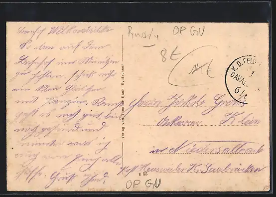 Personenbezogene Daten auf der Rückseite der Karte wurden durch blauen Textmarker unkenntlich gemacht. Die blauen Stellen sind auf die Vorderseite durchgeweicht und wirken sich negativ auf das Postkartenfoto aus
