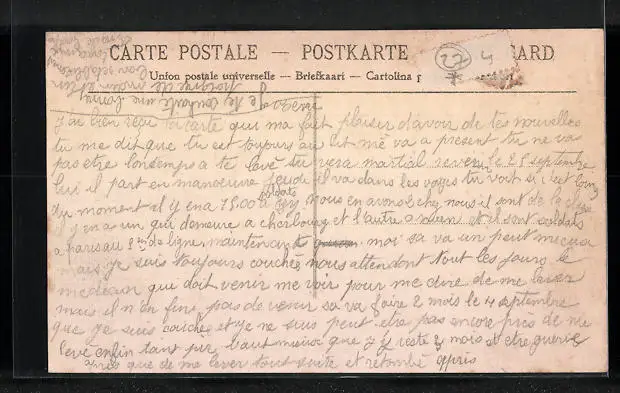 Personenbezogene Daten auf der Rückseite der Karte wurden durch blauen Textmarker unkenntlich gemacht. Die blauen Stellen sind auf die Vorderseite durchgeweicht und wirken sich negativ auf das Postkartenfoto aus