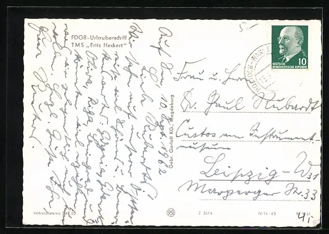 AK FDGB-Urlauberschiff TMS Fritz Heckert auf hoher See
