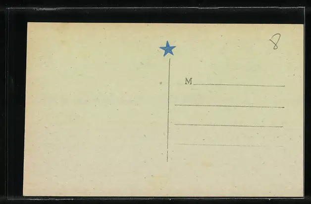 Personenbezogene Daten auf der Rückseite der Karte wurden durch blauen Textmarker unkenntlich gemacht. Die blauen Stellen sind auf die Vorderseite durchgeweicht und wirken sich negativ auf das Postkartenfoto aus