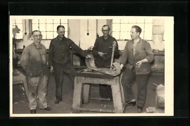 AK Fabrikarbeiter stehen mit Metall an einem Tisch
