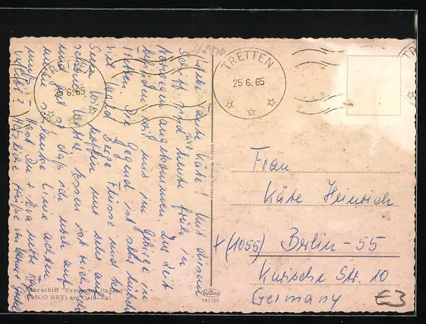 Personenbezogene Daten auf der Rückseite der Karte wurden durch blauen Textmarker unkenntlich gemacht. Die blauen Stellen sind auf die Vorderseite durchgeweicht und wirken sich negativ auf das Postkartenfoto aus