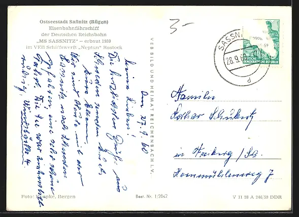 alte Ansichtskarte, gelaufen 1960, Briefmarke entfernt, rückseitig Oberflächenschaden, Eckknick re. oben, guter Zustand