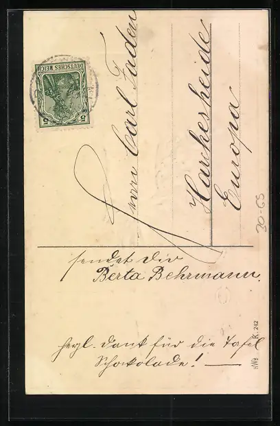Personenbezogene Daten auf der Rückseite der Karte wurden durch blauen Textmarker unkenntlich gemacht. Die blauen Stellen sind auf die Vorderseite durchgeweicht und wirken sich negativ auf das Postkartenfoto aus