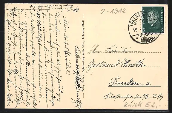 Personenbezogene Daten auf der Rückseite der Karte wurden durch blauen Textmarker unkenntlich gemacht. Die blauen Stellen sind auf die Vorderseite durchgeweicht und wirken sich negativ auf das Postkartenfoto aus