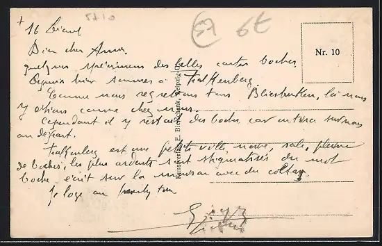 Personenbezogene Daten auf der Rückseite der Karte wurden durch blauen Textmarker unkenntlich gemacht. Die blauen Stellen sind auf die Vorderseite durchgeweicht und wirken sich negativ auf das Postkartenfoto aus