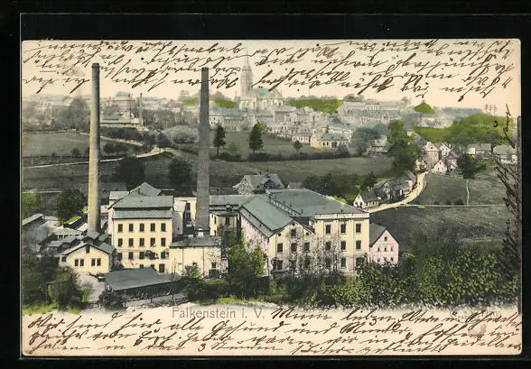 AK Falkenstein i. V., Ortsansicht mit Fabrik