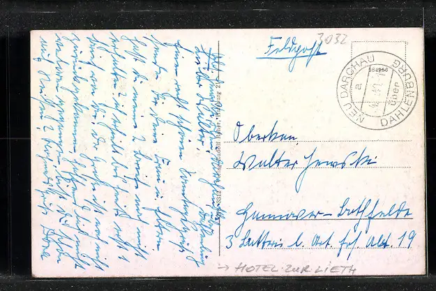 Personenbezogene Daten auf der Rückseite der Karte wurden durch blauen Textmarker unkenntlich gemacht. Die blauen Stellen sind auf die Vorderseite durchgeweicht und wirken sich negativ auf das Postkartenfoto aus