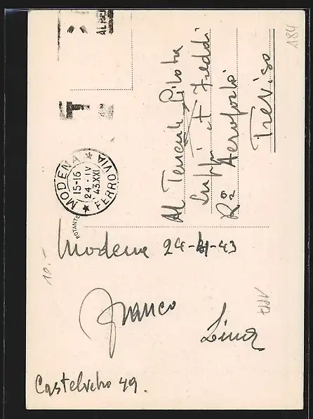 Personenbezogene Daten auf der Rückseite der Karte wurden durch blauen Textmarker unkenntlich gemacht. Die blauen Stellen sind auf die Vorderseite durchgeweicht und wirken sich negativ auf das Postkartenfoto aus