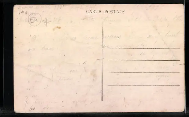 Personenbezogene Daten auf der Rückseite der Karte wurden durch blauen Textmarker unkenntlich gemacht. Die blauen Stellen sind auf die Vorderseite durchgeweicht und wirken sich negativ auf das Postkartenfoto aus
