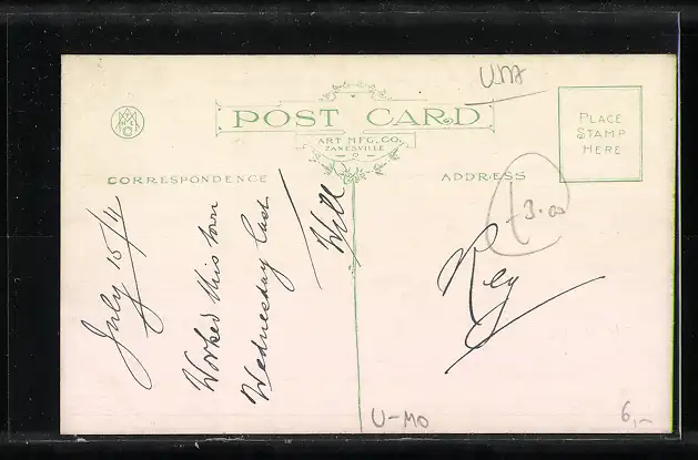 Personenbezogene Daten auf der Rückseite der Karte wurden durch blauen Textmarker unkenntlich gemacht. Die blauen Stellen sind auf die Vorderseite durchgeweicht und wirken sich negativ auf das Postkartenfoto aus